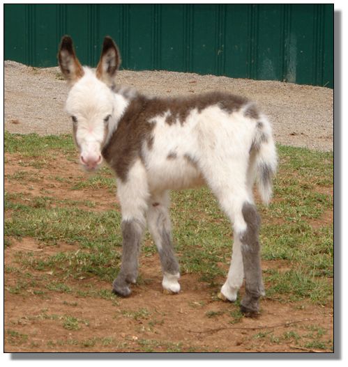 We think Cyn will shed off to be dark brown & white spotted. She actual measured less than 21" tall! I had jury duty the day this jennet was born. I checked bags at 7am before I left for court. Did not arrive home until 10pm as I was hung up deliberating a case with my fellow jury members. I checked bags at 10pm and no one had white milk. My husband arrived home at 1am to find that Inga had foaled this precious jennet who was still wet in the maternity ward! Cyn has a negative coggins report dated 12/29/06.