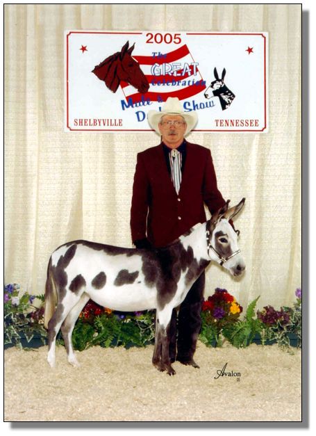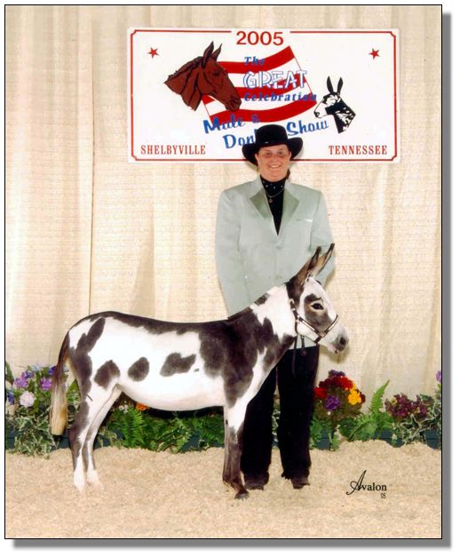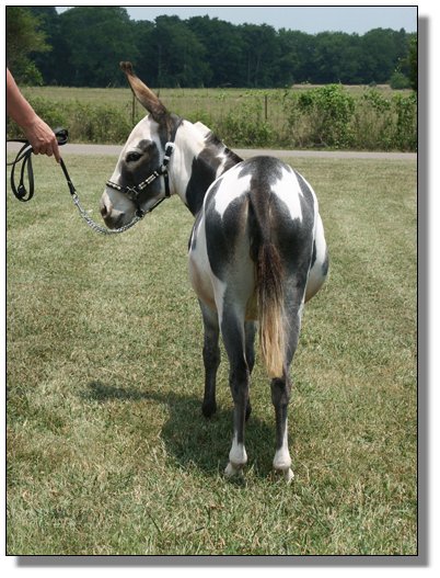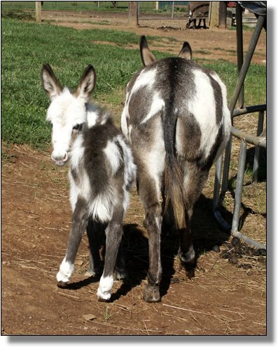 Alanis stood Grand National Spotted Jennet the year we showed her and now she has produced a baby even better than she is....a sign of a great brood jennet! Bow was born on her mom's birthday...no wonder she is the spittin' image of her...but even better. She was expertly delivered by Julia and Rhonda Vaughn while they were house-sitting for us when we were away attending Wayne Lyon's Seminar in Texas. A big 'Thank-You' to both of them for delivering the best spotted jennet ever born on this farm! Also a thanks to Julia for naming her godchild!! So sorry but Rainbow will never be for sale!!!